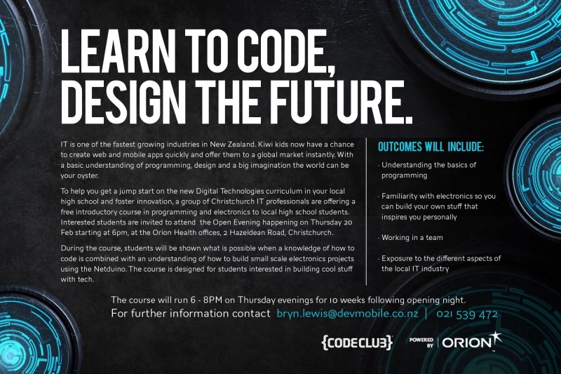 Based on our initial success we figured it was time to go big. A couple of local Digital Technology teachers did a mail out the and we had more than sixty people turn up the first night at Orion Health who provided a space and a pizza budget.