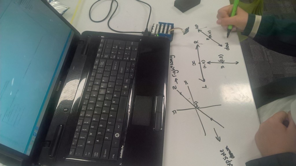 This is her working out how to convert X/Y/Z acceleration G values into roll and pitch, a friendly physics or maths teacher who can co-teach is great. (The whiteboard desks are great but make a mess of the cuffs of white school shirts)